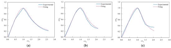 By substituting the calculated values of the parameters obtained from Equation (7) into Equation (6), the normalized stress-strain test curves of steel fiber-reinforced recycled aggregate concrete were compared with those of the computational model. Figure 16 illustrates three representative comparisons of various groups. Therefore, the segmented function demonstrates accuracy in representing the complete stress-strain curve of steel fiber-reinforced recycled aggregate concrete under uniaxial compression. In order to validate the formula, additional data from other references was collected [17,34,35]. Setting λf = 0 in Equation (7) when recycled aggregate concrete without the inclusion of steel fibers was used and setting R = 0 in Equation (7) when ordinary concrete without steel fibers was used. The comparisons are shown in Figure 17. It can be observed that our model has a better fit for calculating the stress-strain relationship of steel fiber-reinforced conventional concrete but shows higher errors in the descending phase when calculating the stress-strain relationship of recycled aggregate concrete [34]. Considering the limited data on recycled fine aggregate samples in the literature, further analysis focused on polypropylene fiber-reinforced recycled aggregate concrete was also conducted using the experimental results [35]. Although a different fiber type was used, polypropylene fibers can also enhance the mechanical properties of recycled aggregate concrete, providing a useful reference for our study. The comparative results, as shown in Figure 17c, indicate a reasonable fit in the descending phase, demonstrating the good applicability of the proposed constitutive equation in this study. Further research on the constitutive relationship of steel fiber-reinforced recycled aggregate concrete is necessary in the future.