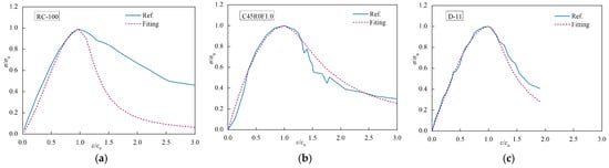 Comparison of test curves in other papers and fitting curves: (a) C45R0F1.0 comparison [34]; (b) RC-100 comparison [17]; (c) D-11comparison [35].