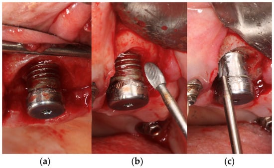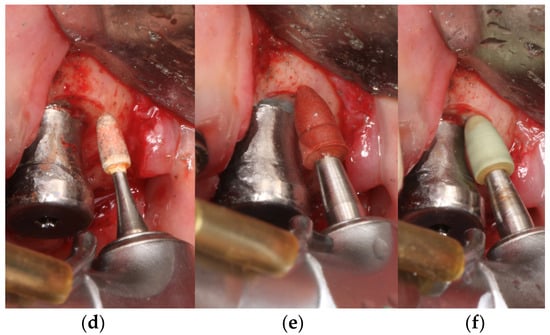 Implantoplasty of commercially titanium grade 3 dental implants (Klockner Implant System, Escaldes-Engordany, Andorra) was carried out by the same investigator (D.F) following the following drilling protocol. Using a GENTLEsilence LUX 8000B turbine (KaVo Dental GmbH, Biberach an der Riß, Germany) under constant irrigation, the surface was sequentially modified with a fine-grained tungsten carbide bur (reference H379.314. 014 KOMET; GmbH & Co. KG, Lemgo, Germany) (Figure 2a). Tungsten carbide burs serve as the primary tool for the initial shaping of implant prostheses, with the size of the bur tailored to the specific area being treated. Typically, larger burs are employed on the vestibular and palatal sides (Figure 2b), while smaller diameter burs are utilized in areas with limited access or interproximal spaces (Figure 2c). These burs effectively remove implant threads, ensuring a smooth surface texture. Additionally, to achieve a refined finish, a series of polishing drills are employed, progressing from coarse-grained to fine-grained drills (Figure 2d–f). A coarse-grained silicon carbide polisher (order no. 9608.314.030 KOMET; GmbH & Co. KG, Lemgo, Germany) and a fine-grained silicon carbide polisher (order no. 9618.314.030 KOMET; GmbH & Co. KG, Lemgo, Germany) [14].