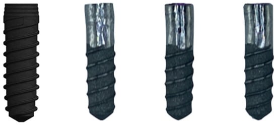 As-received dental implant and three examples of the implant treated by implantoplasty.
