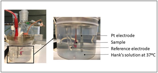 The reactor was a 185 mL polypropylene (PP) tank closed with a polymethyl methacrylate plug with different holes for the introduction of the sample, the reference electrode, and the counter electrode. The test scheme can be seen in Figure 5. The calomel electrode (saturated KCl) was used as a reference in all tests, with a potential of 0.241 V compared to the standard hydrogen electrode. The tests were carried out with the protection of a Faraday cage and at a temperature of 25 °C.