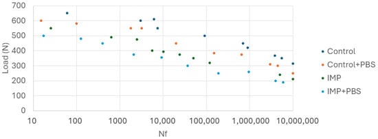 Curves of fatigue for the different dental implants studied. (IMP: implantoplasty and PBS: Physiological Body Simulation by Hank’s solution at 37 °C).