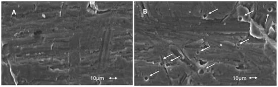(A) Surface of the titanium control after corrosion test (B). Samples with implantoplasty treatment after the corrosion test. Arrows indicate the pitting.