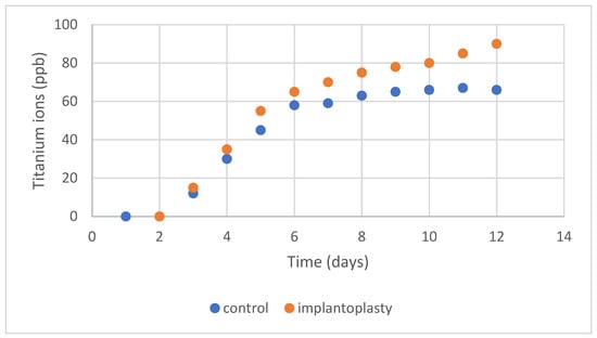 The titanium ion release results have a curve of a rapid increase and then enter a constant release zone, being able to appreciate an increase in the values of higher ions for the samples with implantoplasty. However, the values obtained are relatively low, in the order of ppb, which with respect to other endosseous implants in the human body, such as hip or knee implants, are values of ppm. It is for this reason that the release of ions should not be of excessive concern [56,57,58,59,60].