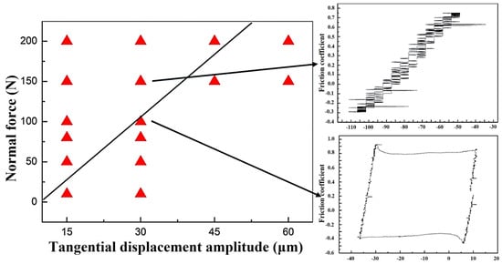 Studies have indicated the crucial role of constructing fretting maps in the investigation of fretting wear. These maps not only outline comprehensive behaviors, encompassing contact conditions, fretting regions, and damage mechanisms, but also delineate three fretting regimes: a partial slip regime (PSR), mixed fretting regime (MFR) and gross slip regime (GSR) [,,]. In PSR, the tangential friction force linearly increases with displacement, forming a quasi-closed line. At the same time, slight slippage occurs at the contact edge without relative motion, with crack initiation at the interface. In MFR, the motion regulation mechanism is complex. Throughout various fretting processes, the contact surface may be dominated by either relative sliding adjustment, elastic deformation, or plastic deformation. In GSR, tangential friction exhibits significant fluctuations, particularly in the initial stages, yet the friction–displacement (Ft-D) curve typically forms a parallelogram, indicating noticeable relative slip between the two contacts [,].