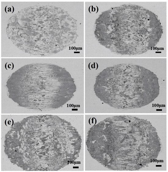 Figure 3 shows the surface morphologies of wear scars observed through SEM in BSE mode under various Cl− concentration solutions, contrasting with dry friction conditions under identical fretting test parameters []. Based on the contrast between light and dark regions in the SEM images, it can be inferred that the darker regions represent the oxide layer while the brighter regions represent the matrix []. Specifically, it can be found from Figure 3a–f that the oxide film formed in the central contact area of the wear scar exhibits incompleteness, with localized shedding of the oxide film observed on both sides of the wear scar. The mechanism underlying the formation of incomplete oxide layers is multifaceted. On the one hand, the limited presence of dissolved oxygen in water constrains the rate and integrity of oxide layer formation. On the other hand, wear debris initially formed tends to diffuse into the solution during the frictional process following oxidation, thus hindering the formation of a dense oxide layer.