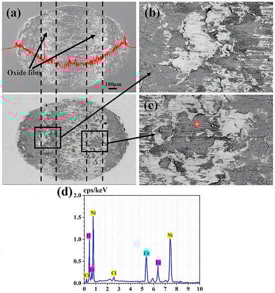 Taking the fretting wear results in 0.9% Cl− concentration solution as an example [], the wear damage characteristics in a water environment were analyzed. Figure 4a shows the wear morphology of the sample and the wear profile traced along the center of the wear scar. Notably, the wear scar exhibits a semi-elliptical shape, while the BSE image reveals the emergence of a black oxide layer at the bottom edge of the wear scar. Figure 4b,c show the magnified morphology at the black rectangular position in Figure 4a. In Figure 4b, the oxide layer appears to peel off from the white substrate, with numerous cracks observed at the junction of the substrate and the oxide layer. Figure 4c further reveals the serious oxidation phenomenon at the crack. Figure 4d shows the energy spectrum results of the marker points in Figure 4c. It can be found that O and Cl were detected on the worn surface, indicating oxidation occurs during fretting wear in the case of 0.9% Cl−.