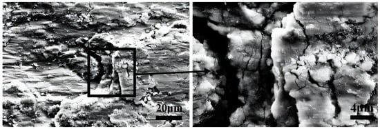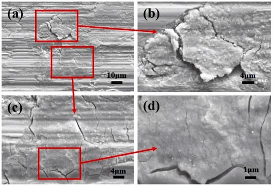 Figure 5 shows the SEM morphologies of the wear scar center following fretting wear in a 0.9% Cl− concentration solution. The prominent grooves aligned with the fretting direction can be observed in Figure 5a. Further magnification of the morphology reveals the presence of cracks along the fretting direction, as depicted in Figure 5c,d, along with nubbly delamination observed in Figure 5b.