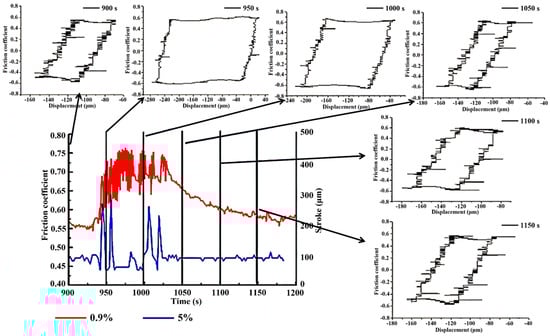 Significantly, when the amplitude experiences a sudden increase, the friction coefficient concurrently increases. However, as the amplitude stabilizes, the friction coefficient gradually decreases. This oscillatory phenomenon is attributed to the surface condition. During periods of stability, wear debris are discharged with the flow of water. However, during the central metal-to-metal contact state characterized by reciprocating motion, the region experiences significant contact tangential stress. Upon the detachment of the bulk oxide formed at the central contact position, stress is suddenly released, leading to a rapid expansion of displacement towards the oxide layer areas at both ends, as demonstrated in Figure 4. This process induces a sudden increase in the area enclosed by the hysteresis curve, resulting in surface roughening and a rapid increase in the friction coefficient. Subsequently, as the amplitude stabilizes, the friction coefficient decreases to a stable value.