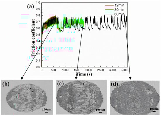 Figure 7 shows the variation curve of friction coefficient over time in a 12% Cl− concentration solution, along with surface BSE morphology images captured at different intervals throughout the test. In these images, the darker regions correspond to the oxidized portions resulting from the test. Analysis of Figure 7b reveals that at the onset of the test, the wear surface exhibits non-uniformity, primarily comprising the bare matrix with distinct blocky oxide layers. As the fretting wear test proceeds, the width of the wear scar gradually increases, and the surface tends toward flatness, as shown in Figure 7c. Eventually, the entire wear scar area becomes enveloped by an oxide layer, as shown in Figure 7d. However, it is noteworthy that after 500 s, the friction coefficient continues to exhibit periodic fluctuations, failing to stabilize at a constant value. This phenomenon was attributed to the energy dissipation due to the variation of friction/wear periods [,]. This observation further underscores that the oxide layer formed in the aqueous environment lacks stability, consequently failing to effectively mitigate wear.