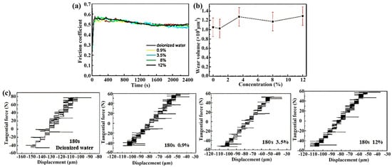 Based on the previous conclusions regarding the instability of friction amplitude and the low signal-to-noise ratio associated with parameters in GSR, adjustments are made in accordance with the running condition fretting map to select parameters falling within the PSR. As shown in Figure 8a, under the adjusted experimental conditions, the friction coefficient curves exhibit stability and demonstrate characteristic behavior indicative of PSR. Notably, the friction coefficient initially reaches 0.57 and eventually stabilizes at approximately 0.5. In Figure 8b, the variation curve of wear volume is depicted. Within the margin of error, the wear volume consistently hovers around 1.1 × 106 μm3, a significant reduction compared to the wear volume observed in the GSR. Furthermore, different concentrations of Cl− solutions have minimal effect on the wear volume. Figure 8c shows the Ft-D curves of each sample under various Cl− concentration solutions at 180 s. These curves validate that the fretting is indeed in the PSR.