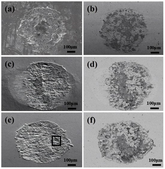 The surface SEM and BSE morphologies of the wear scars at solutions with different Cl− concentrations. (a,b) Deionized water, (c,d) 3.5%, (e,f) 8.0%.