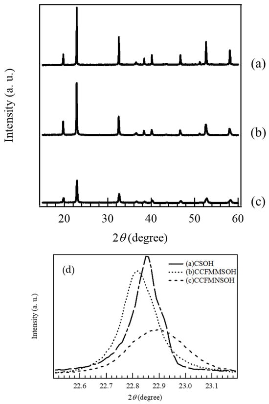 XRD patterns of (a) CSOH, (b) CCFMMSOH, and (c) CCFMNSOH, and (d) enlarged XRD patterns of CSOH, CCFMMSOH, and CCFMNSOH at 2θ = 22.5° to 23.2°.