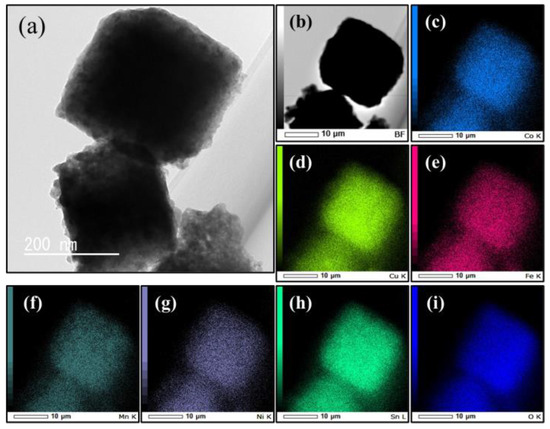 (a) TEM image, (b) STEM image, and elemental mapping images of CCFMNSOH: (c) Co, (d) Cu, (e) Fe, (f) Mn, (g) Ni, (h) Sn, and (i) O.