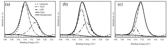 Figure 4 shows the XPS O 1s spectra of (a) CSOH, (b) CCFMMSOH, and (c) CCFMNSOH. We can confirm from the XPS spectra in Figure 4 that there is one broad peak in the O 1s spectra of CSOH, CCFMMSOH, and CCFMNSOH, and that this peak can be deconvoluted into two waveforms, with one due to the OH bond around 532–533 eV and the other due to the H2O bond around 533–534 eV [19]. Table 2 lists the relative ratios of the OH bonds and H2O-derived bonds in CSOH, CCFMMSOH, and CCFMNSOH as determined from the waveform separation of the O 1s spectra. OH has been reported to originate from water molecules adsorbed to oxygen vacancies, and H2O has been reported to originate from water molecules irreversibly adsorbed to the surface [19]. The high-entropy material CCFMNSOH had an increased ratio of OH bond species, which was inferred to be due to an increase in oxygen vacancies. This result was in agreement with the XRD result that the crystallinity of CCFMNSOH decreased the most. This decrease in crystallinity could further facilitate the formation of oxygen vacancies, thereby enhancing the material’s surface reactivity. The correlation between the increased OH bond ratio and the presence of oxygen vacancies in CCFMNSOH highlights the material’s unique surface properties, which are critical to its catalytic performance [20].