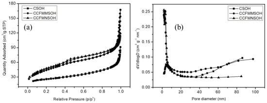 (a) N2 adsorption-desorption plots and (b) pore diameter distribution curves of CSOH, CCFMMSOH, and CCFMNSOH.