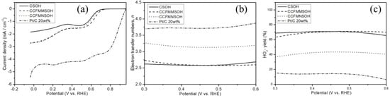 (a) ORR curves of CSOH, CCFMMSOH, CCFMNSOH, and Pt/C 20 wt% in O2-saturated 0.1 M KOH aqueous solution. Change in (b) electron transfer numbers (n), and (c) HO2− yields of CSOH, CCFMMSOH, CCFMNSOH, and Pt/C 20 wt.% as a function of potential.