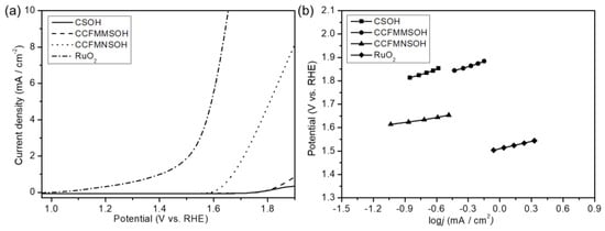 (a) OER curves of CSOH, CCFMMSOH, CCFMNSOH, and RuO2 in O2-saturated 0.1 M KOH aqueous solution. (b) Tafel plots of the composite samples synthesized at CSOH, CCFMMSOH, CCFMNSOH, and commercial RuO2.