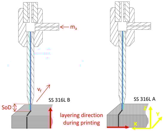 The dimensions and shapes of the specimens were proposed based on mechanical properties influenced by the printing direction in dimensions (X, Y, Z) of 25 × 100 × 10 mm and 25 × 10 × 100 mm. The specimens of material SS 316L were labeled according to the printing direction as SS 316L A and SS 316L B (Figure 1).