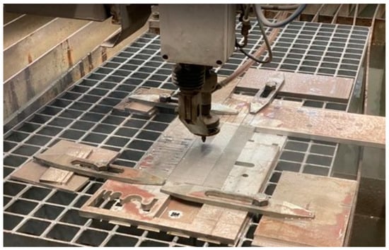 The experiment was conducted using the Water Jet 3015 RT-3D device (Kovostrojservis, spol. s.r.o, Pardubice, Czech Republic) with a table area of 3000 mm × 1500 mm. The machine is equipped with a 45-degree 3D cutting head tiltable in the X and Y direction. Water pressure is generated by a high-pressure pump, PTV Jets 3.8/60. The equipment can generate a maximum water pressure of 415 MPa with a flow rate of 3.8 liters per minute.
