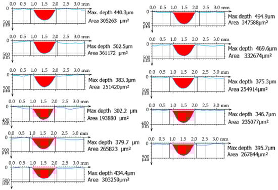 Figure 6. Cross-sections of the erosion groove, vf 60 mm·min−1, ma 60 g·min−1, SoD 4 mm, and material SS 316L B.