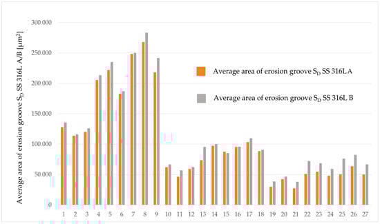 A graphical representation of average areas of erosion grooves (SD SS 316L A and SD SS 316L B) for all combinations of technological parameters is shown in Figure 8.