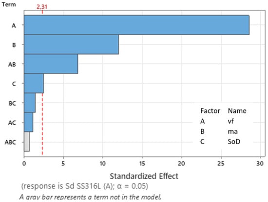 The Pareto chart of the standardized factors for technological parameters and the specific combinations of the regression model is shown in Figure 13. The critical value for the significance of factors and their interactions is 2.31. The Pareto chart (Figure 13) illustrates the influences of input parameters and their combinations on the observed dependent variable SD SS 316L A. The predictor A, corresponding to the traverse speed vf with a value of 28.58, has the greatest impact. The second impact with value 11.8 corresponds to predictor B (ma). Just on the significance boundary is the predictor C, standoff distance SoD with a value of 2.51.