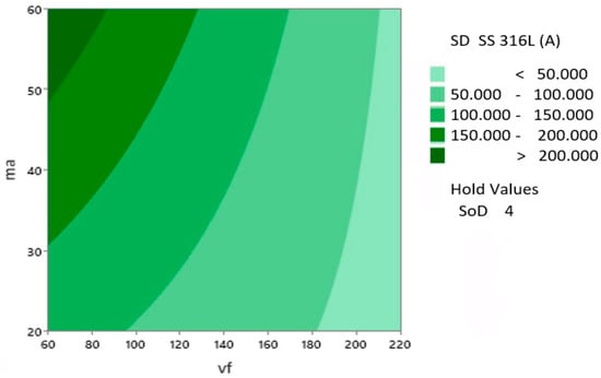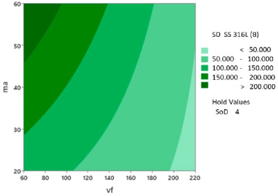 Figure 16. Contour plot of SD SS 316L A vs. ma, vf, SoD fixed on 4 mm.