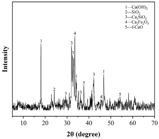 Mineral carbonation is recognized as a viable approach for the storage and sequestration of carbon [14]. This natural process is exemplified by the formation of stalactites, which involve the slow solidification of CO2 by natural calcium/magnesium minerals. Interestingly, the primary mineral components of steel slag resemble those found in cement, including phases like C3S, C2S, and C4AF. Additionally, steel slag contains minor amounts of C2F and various oxides such as magnesium, iron, and manganese, which are products of the solid solution of the RO-phase and other non-cementitious minerals [15]. The high carbonation reactivity of steel slag is attributed to its content of calcium hydroxide and silicates [6,15]. The rapid carbonation process of steel slag precipitates chemically stable carbonates, which results in a swift enhancement of its mechanical strength. Moreover, the application of CO2 treatment can neutralize free lime (f-CaO) and magnesia (f-MgO) present in the slag, thereby augmenting its overall stability [16].