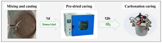 HCPC was prepared according to the mixing ratio, then cast and molded into 40 × 40 × 40 mm cubic specimens, which were used for compressive strength testing, rectangular specimens of 40 × 40 × 160 mm were used for freeze–thaw cycles, and cylinders of φ100 × 50 mm were used for resistance to chloride erosion. These were sealed in their molds and cured in a constant temperature room at 20 ± 2 °C for one day. After demolding, the specimens were pre-dried in a blast drying oven at 40 °C for 12 h before being placed in a carbonation pressure reactor for further curing. The curing process began by opening the reactor’s outlet valve and flushing the reactor with a continuous flow of 99.9% CO2 for 30 s to expel any air. The outlet valve was then closed, and CO2 injection continued until the internal pressure reached 0.4 MPa, exceeding the external atmospheric pressure. After 12 h of carbonation curing, the specimens were removed for testing. Figure 3 provides a schematic representation of the specimen preparation process.