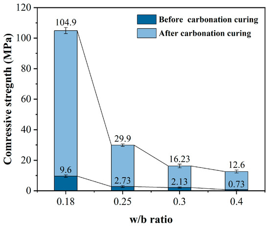 The influence of varying water cement ratio on the mechanical properties of HCPC was studied, both before and after carbonation. Figure 4 shows the effect of four different w/b ratios on the compressive strength of HCPC. The figure demonstrates that the compressive strength of HCPC significantly decreases as the w/b ratio increases from 0.18 to 0.4, both before and after carbonation curing. This is due to the large amount of low hydration activity CSS used, which results in excess water at higher w/b ratios. This excess water leads to increased particle spacing and a looser structure within the specimen [29]. After just one day of hydration curing, the production of hydration products is minimal, resulting in very low compressive strength before carbonation curing. The high w/b ratios also lead to a loose and porous structure, which means that the carbonation products generated after carbonation curing are insufficient to fill the internal pores of the system [30]. As a result, the compressive strength remains low even after carbonation curing. However, when the w/b ratio is reduced to 0.18, some water is consumed by cement hydration or can be evaporated during pre-dried curing. This results in a smaller internal particle spacing within the HCPC system. After further carbonation curing, the carbonation products can fill the internal pores, significantly improving the compressive strength, which can reach close to 104.9 MPa.