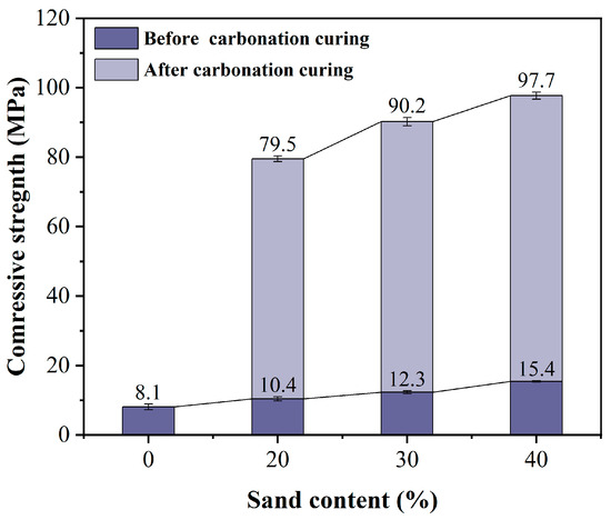 Figure 7 shows the relationship between the compressive strength of HCPC and the aggregate volume fraction before and after carbonation curing. The graph clearly shows a continuous increase in compressive strength as the aggregate volume fraction rises. HCPC mixtures with 30% and 40% aggregate volume fractions have a dense system structure. The products from the carbonation reaction fill the pores, binding the hardened body into a cohesive unit, resulting in relatively high compressive strength post-curing [16]. It merits attention that specimens with a sand content of 0% result in pure slurry specimens. These pure mortar specimens undergo a vigorous exothermic reaction during carbonation curing, which induces substantial expansion and subsequent cracking. As a result, there is an absence of compressive strength data for these specimens post-curing. Moreover, the incorporation of aggregates serves to augment the overall stability of the matrix.