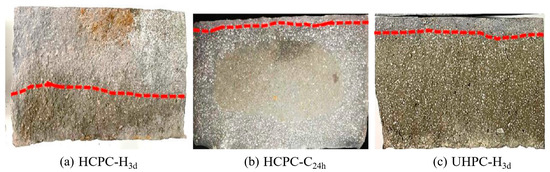 As demonstrated in Figure 8, which displays the color development images from the Rapid Chloride Migration (RCM) test under various carbonation curing conditions, where the red line indicates the demarcation line between developed and non-developed colours. It is noteworthy that a distinct non-carbonated area is present in the center of the section post-curing. The color produced by AgNO3 solution spray tanning resembles that of the carbonated region, and upon closer inspection, the boundary of the chloride infiltration zone can still be discerned, where HCPC has a shallower depth of chloride erosion after 24 h of carbonation curing after pretreatment that UHPC after 3 d of hydration maintenance displays. Table 3 presents the calculation of the chloride ion diffusion coefficient, revealing that carbonation curing significantly enhances the resistance to chloride ion penetration in the products. This is due to the carbonation byproducts that fill most pores and decrease the overall matrix porosity. Notably, a dense outer layer effectively blocks the pathways for chloride ions to penetrate the concrete, endowing the post-carbonation cured products with superior impermeability to chloride ions [35].