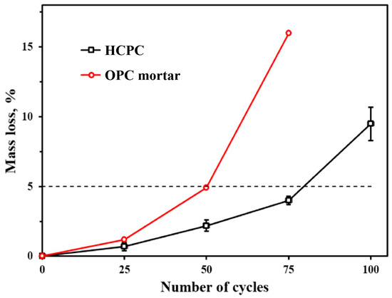 Figure 10 shows the mass loss rates of both HCPC and ordinary Portland cement mortar (OPC) specimens following various freeze–thaw cycles. The mass loss rates for OPC mortar specimens, as depicted in the figure, were reported by other researchers [36]. The comparative analysis clearly demonstrates that HCPC exhibits enhanced frost resistance relative to OPC mortar. Even after enduring 75 freeze–thaw cycles, HCPC maintains compliance with the maximum permissible mass loss threshold for the freeze–thaw cycle test, a benchmark that OPC mortar surpasses after only 50 cycles. As the cycle count escalates, the specimens incur more pronounced damage, culminating in a weakened internal structure and an accelerated degradation rate due to surface spalling.