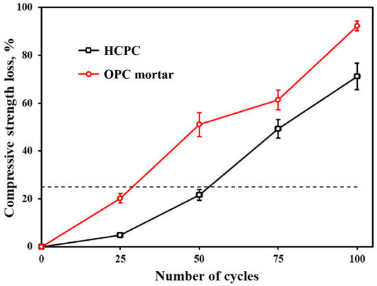 Loss of compressive strength of HCPC and OPC mortars at different numbers of freeze–thaw cycles.