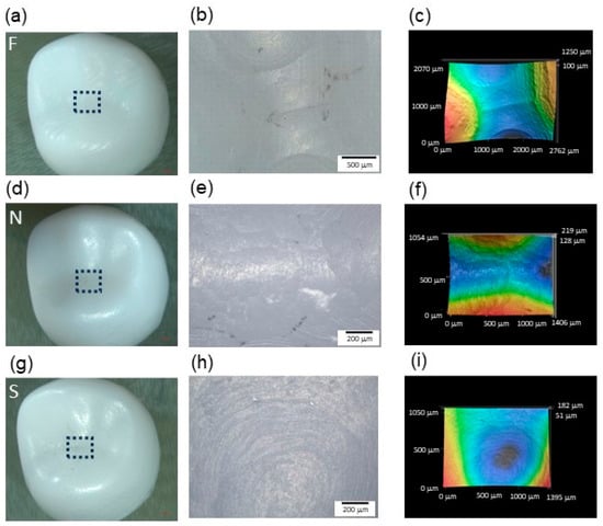 Morphology and surface profile assessed at the central groove of the crowns produced with F (a–c), N (d–f), and S (g–i) milling protocols. The region of interest (ROI—black doted box) on the occlusal surface of the crown was observed using 20× lens. After leveling out the scan images, 3D surface profiles were generated. Images (b,c), (e,f), and (h,i) correspond to the area delimited in the black box of (a), (d), and (g), respectively.