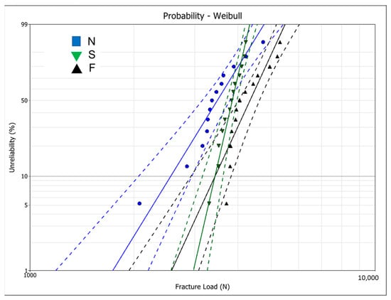 All crowns survived the chewing simulation and were tested under compressive load until fracture. The raw data is available in the Supplementary Materials (Table S1). The Weibull analysis of the fracture load data is presented in Table 3 and Figure 4. Group F had a significantly higher characteristic fracture load (L0) than groups N and S as the 95% confidence intervals did not overlap. Group S had the highest Weibull modulus (m), being significantly higher than group N.