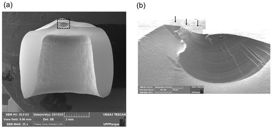 Fractographic analysis of a crown from group N. (a) SEM image of the crown showing an area of contact damage in the occlusal surface. (b) Closer view of the area delimited by the black box in image (a). Black arrows indicate the marks created by the milling burs on the crown occlusal surface.