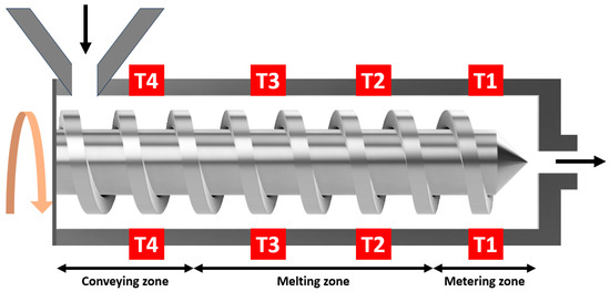 The DSC result, as shown in Figure 3, indicates that the Tm of raw PLA pellets is approximately 153 °C, consistent with the PLA supplied by NatureWorks LLC [25]. As depicted in Figure 4, the single screw filament maker consists of conveying, melting, and metering zones, each serving a specific function. The heating point in the conveying zone, near the hopper, should be kept below the Tm of PLA pellets. Excessive heating could liquefy the polymer, preventing it from being pushed into the melting zone. Within the melting zone, the temperature must surpass the Tm to ensure the PLA fully melts and effectively blends with the Mg-Ca powder. Elevating the temperature above 200 °C might initiate PLA molecular chain breakdown, potentially compromising the filament’s mechanical properties [26]. Moreover, the temperature of the metering zone should be optimised to consistently maintain the filament’s thickness. The second and third heating points in the melting zone, as shown in Figure 4, are the most critical, since the temperature of the melting zone significantly affects the filament’s mechanical properties and the blend’s quality.