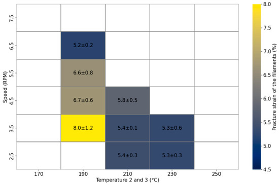The correlation between extrusion speed, temperature, and the resulting ductility of PLA filaments is depicted in Figure 5. Among the tested conditions, the filament fabricated at 3.5 revolutions per minute (RPM) and 190 °C exhibited the highest ductility, recorded as 8%. It is recognised that the mechanical properties of PLA, such as elongation, are influenced by factors including molecular weight and crystallinity [27]. Elevated temperatures, particularly those beyond 200 °C, initiate the degradation of PLA, leading to a reduction in molecular weight and, consequently, a decrease in elongation [26]. On the other hand, it can be stated that the crystalline structure of PLA is affected by the cooling rate. A slower rate of cooling permits more time for PLA to develop a crystalline structure, which is typically associated with diminished elongation [28]. However, at 190 °C, an increase in RPM results in decreased elongation due to the incomplete melting of the PLA pellets. When the temperature surpasses 210 °C with an RPM exceeding 5.5, or when it exceeds 230 °C with an RPM greater than 4.5, PLA exhibits liquid-like behaviour, rendering it unsuitable for filament formation. In contrast, at temperatures below 190 °C, PLA is not fully melted, which also hinders its ability to be formed into filaments. Consequently, the process of forming PLA into filaments is compromised at both ends of the temperature spectrum: excessive temperatures result in a liquefied state, whereas insufficient temperatures prevent the complete melting of the polymer. This emphasises the critical need for precise control of temperature and RPM during filament extrusion to ensure the effective production of PLA filaments.