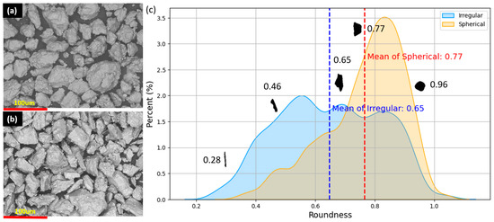 SEM image of (a) spherical particles, (b) irregular particles, and (c) roundness of spherical and irregular shape particles from laser diffraction analysis and Python image analysis.