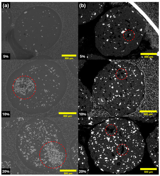 (a) Microstructure of spherical Mg-Ca powder (D50: 105 μm) composite filaments using PLA at Mg-Ca powder content of 5 vol.%, 10 vol.%, and 20 vol.%. (b) Microstructure of spherical Mg-Ca (D50: 105 μm) composite filaments using PLA blended with paraffin wax and stearic acid at Mg-Ca powder content of 5 vol.%, 10 vol.%, and 20 vol.%.