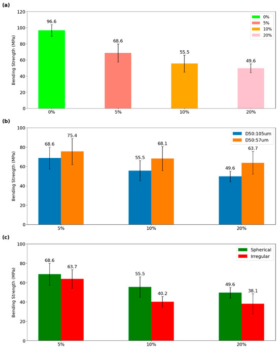 Similarly, the morphology of the powder particles played a critical role, with spherical particles outperforming irregular ones in bending strength. This is likely due to the uniform geometry of spherical particles, which facilitates better stress distribution and potentially stronger particle–matrix bonding. In terms of viscosity, composites with spherical particles exhibited lower viscosities at lower volume fractions, but this trend reversed at higher volume fractions, highlighting the complex interplay between particle shape and composite rheology.