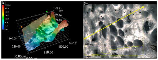 Fracture surfaces of a 20 vol.% Mg-Ca composite filament upon the three-point bending tests were also investigated. In Figure 10a, the colour gradient helps visualize the height distribution, with the highest peaks marked in red and the deepest valleys in blue. The 3D surface topology reveals a varied surface, with heights ranging from 0 to 308.92 μm, indicating significant surface roughness. The highly irregular fracture surface is likely due to poor adhesion, which can lead to debonding at the PLA–wax interface, resulting in a rough and uneven surface. Poor adhesive qualities between wax and PLA are the primary mechanism for bending fracture. Fracture initiation occurs along the wax and stearic acid network, which coats the Mg-Ca powder. In Figure 10b, the fracture surface shows regions where embedded Mg-Ca powder and pores are concentrated. The porosity is attributed to the pores left by the detached Mg powder during the bending test. These pores and embedded magnesium particles have a significant impact on the fracture behaviour.