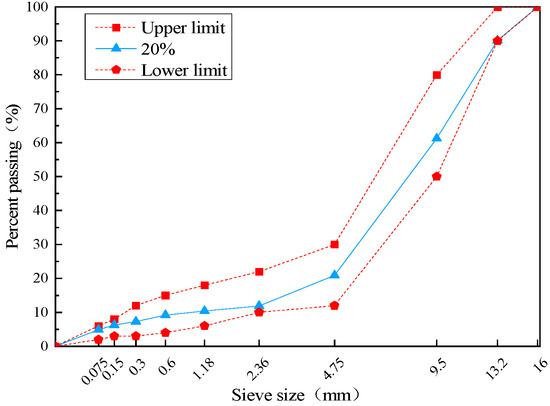 where A is the aggregate total surface area; a, b, c, d, e, f, g are 4.75, 2.36, 1.18, 0.06, 0.3, 0.15, and 0.075 mm sieve through the percentage, %; h stands for the asphalt film thickness (h = 14 μm); and Pb stands for the initial asphalt dosage, %.