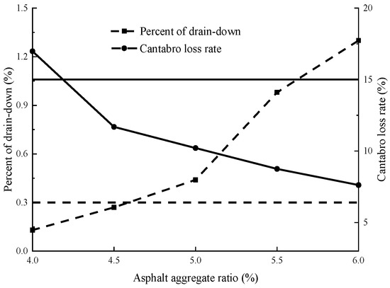 Based on the “Highway Engineering Asphalt and Asphalt Mixture Test Procedures” (JTG E20-2011), the mixture was prepared according to five asphalt aggregate ratios of 4, 4.5, 5, 5.5, and 6%, and it was subjected to Schellenberg binder drainage and Cantabro tests, and the findings of the tests are illustrated in Figure 2.
