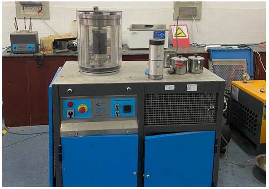 According to the dynamic modulus test requirements in AASHTO TP62-2007 [19], the test temperature is 4, 15, 25, 40, and 55 °C. Combined with the actual force of the road surface, three confining pressures of 0, 100, and 200 kPa are selected, and the loading frequency is 0.1, 0.5, 1, 5, 10 and 20 Hz. As shown in Figure 4, the test instrument is selected from the SPT tester produced by the Australian IPC company. The instrument is capable of carrying out an asphalt mixture dynamic modulus test, repeated loading permanent deformation test, etc. The equipment consists of an electro-hydraulic loading system, a perimeter pressure system, an environmental chamber and a corresponding control system, using air as the perimeter pressure. Before the test, the specimen is put into the specified constant temperature box insulation for 4 h, turning on the instrument power system, and keeping the temperature of the test chamber to the specified temperature. The displacement sensor is installed in the middle of the side of the specimen according to the specification, put on the rubber membrane, and fixed in the test chamber. Under the specified temperature conditions, the specimen can be applied with controllable sinusoidal pressure of different frequencies, the load value is 13.5 kN, and the strain control mode is adopted with strain range of 85–115 με. Then, the dynamic modulus of resilience test begins. The test sequence is from low temperature to high temperature, the same temperature, and from high frequency to low frequency. The dynamic modulus and phase angle are expressed as Equations (4) and (5).