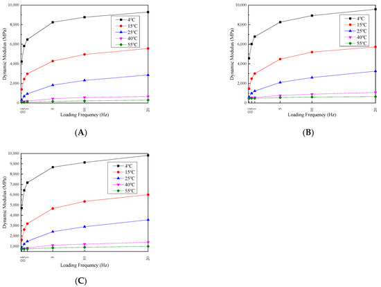 Dynamic modulus at confining pressure values of (A) 0, (B) 100 and (C) 200 kPa.