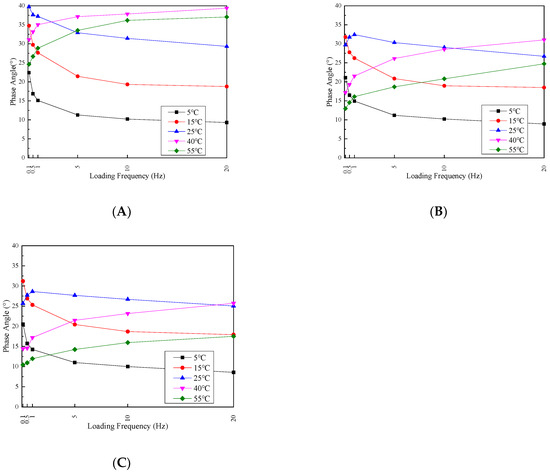 Phase angle at different confining pressure values of (A) 0, (B) 100 and (C) 200 kPa.