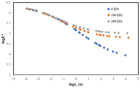 According to the findings of this research, the logarithms of the measured loading time and dynamic modulus are taken, and Equation (6) is used as the fitting function. The comparison of the shift factor and main curve under the three confining pressure conditions is shown in Figure 11 and Figure 12.